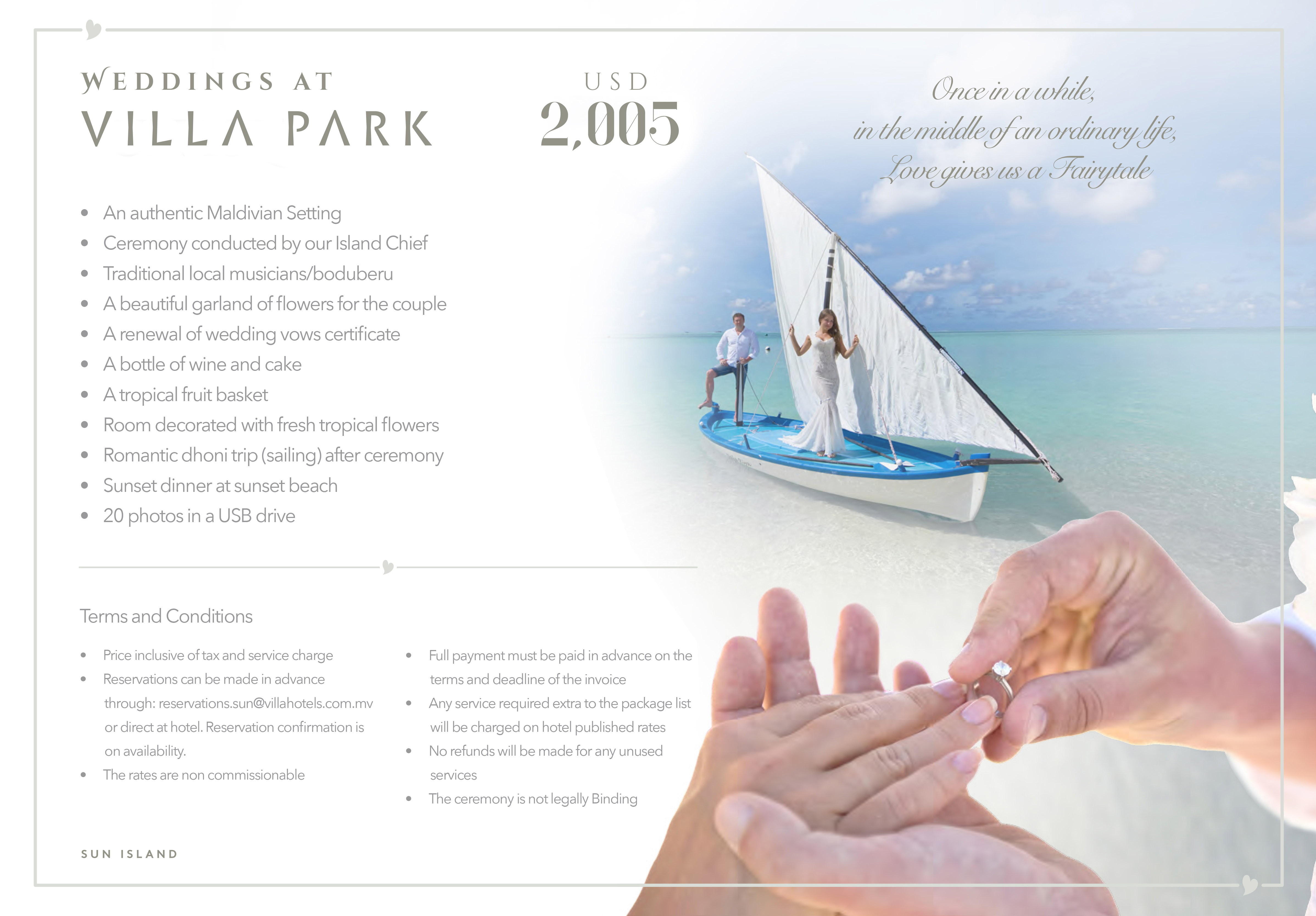 Our package includes a private renewal of vows ceremony on the beach, with music and local Boduberu dancers and drummers, who will also walk you to your beautiful arch of flowers on the shoreline. After the ceremony, you will set sail on a romantic boat trip on a traditional dhoni, followed by a private sunset dinner on the beach.